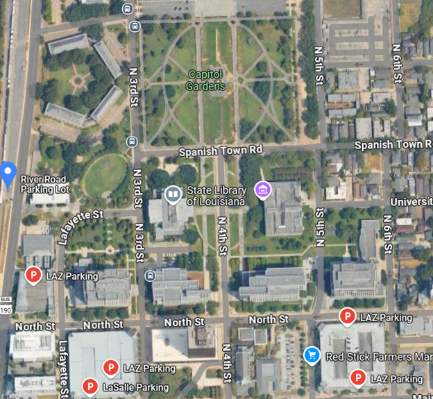 For free street parking near the Louisiana State Capitol building in Baton Rouge, consider parking on Spanish Town Road, along Capitol Access Road, or in the River Road lots. Arrive early if you are trying to park on the street!